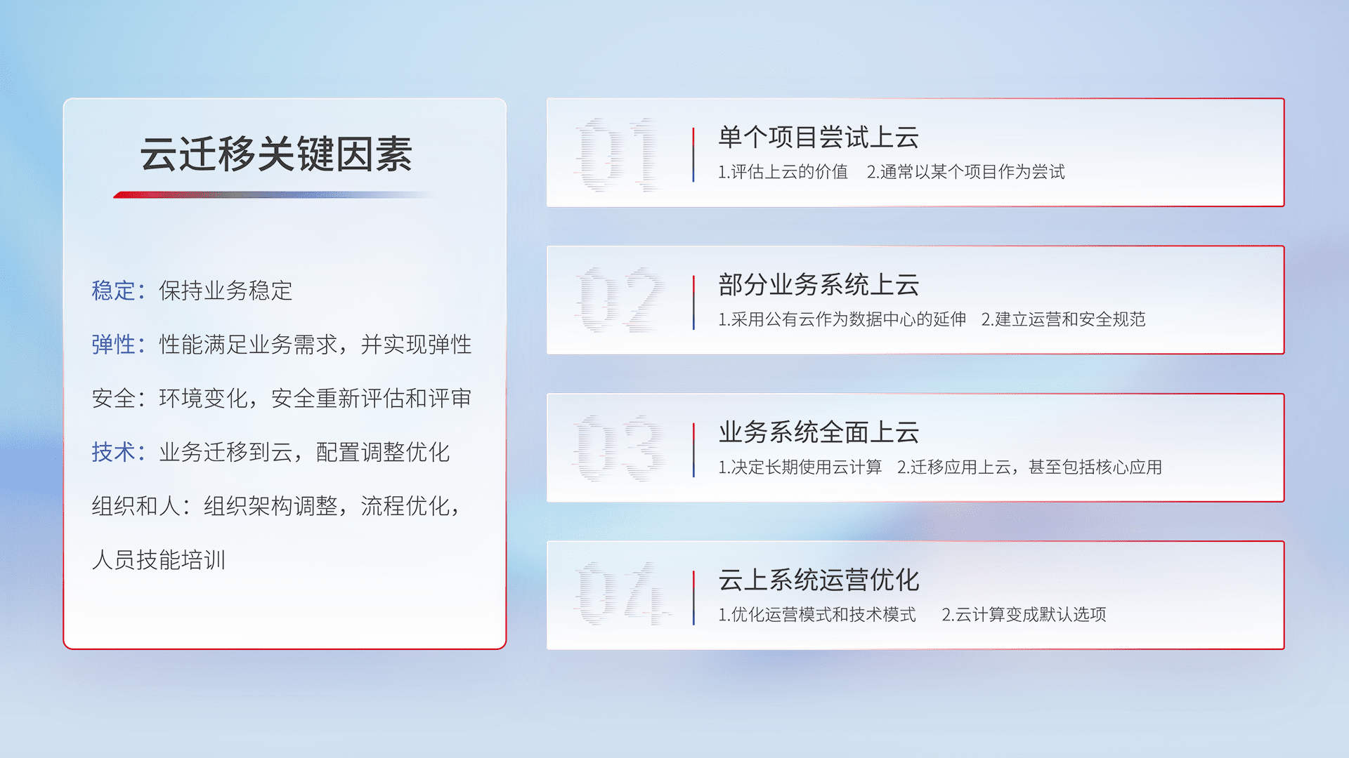 结合实际业务,,,从规划设计、、、、云平台选型、、、、云原生改造、、、、数据迁移、、集成交付,,迁移全过程为客户识别最佳上云路径,,,做好风险识别管理,,,,设计网络架构、、、身份权限、、、、安全审计合规、、操作审计、、、、日志审计、、、监控告警策略、、、多站点容灾设计等,,,对云上基础设施进行整体规划,,,,提升IT治理水平,,以满足弹性、、、高可用、、、高性能的需求。。
