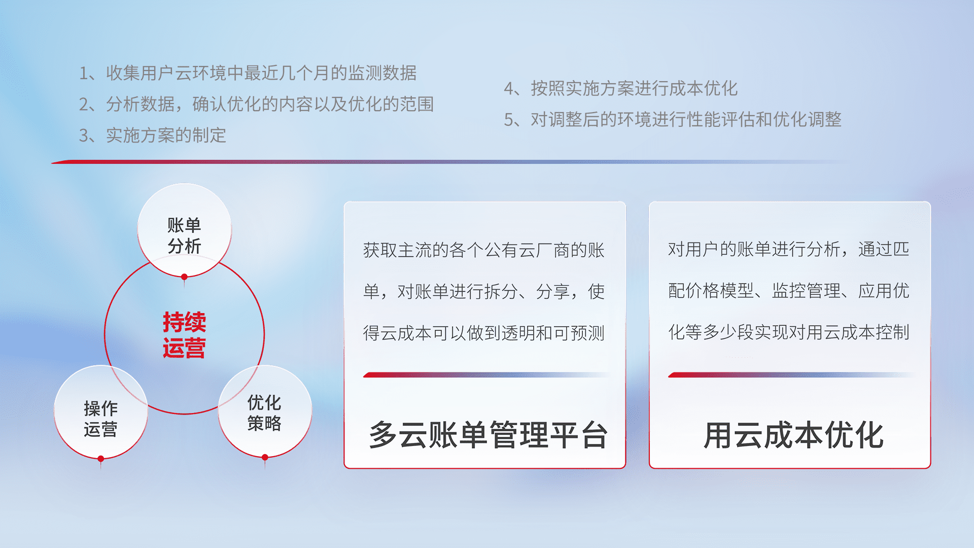 通过多云纳管,,,以统一的资源数据模型把客户的云资源进行抽象和封装,,进而实现对多云资源的统一操作,,,,保障云资源管理的可靠性、、、稳定性与可用性。。。。量身定制化运维内容,,,配置、、开发运维、、、补丁管理、、、备份、、、、监控、、、、认证和访问管理、、审计和日常巡检等,,保障在用云过程中的可靠度,,,,稳定度以及高可用率。。。。